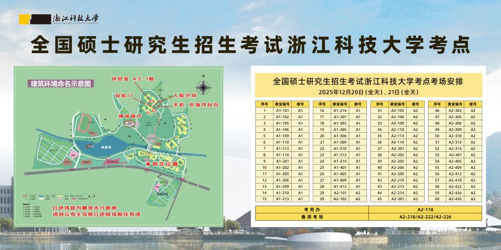 12月20、21日考场安排在浙江科技大学A1和A2教学楼(备用考场在A2教学楼),考场距离正大门800米左右。考生可在12月19日15:00之前凭借准考证入校查看。考生休息室在A3-117、A3-121、A3-125。